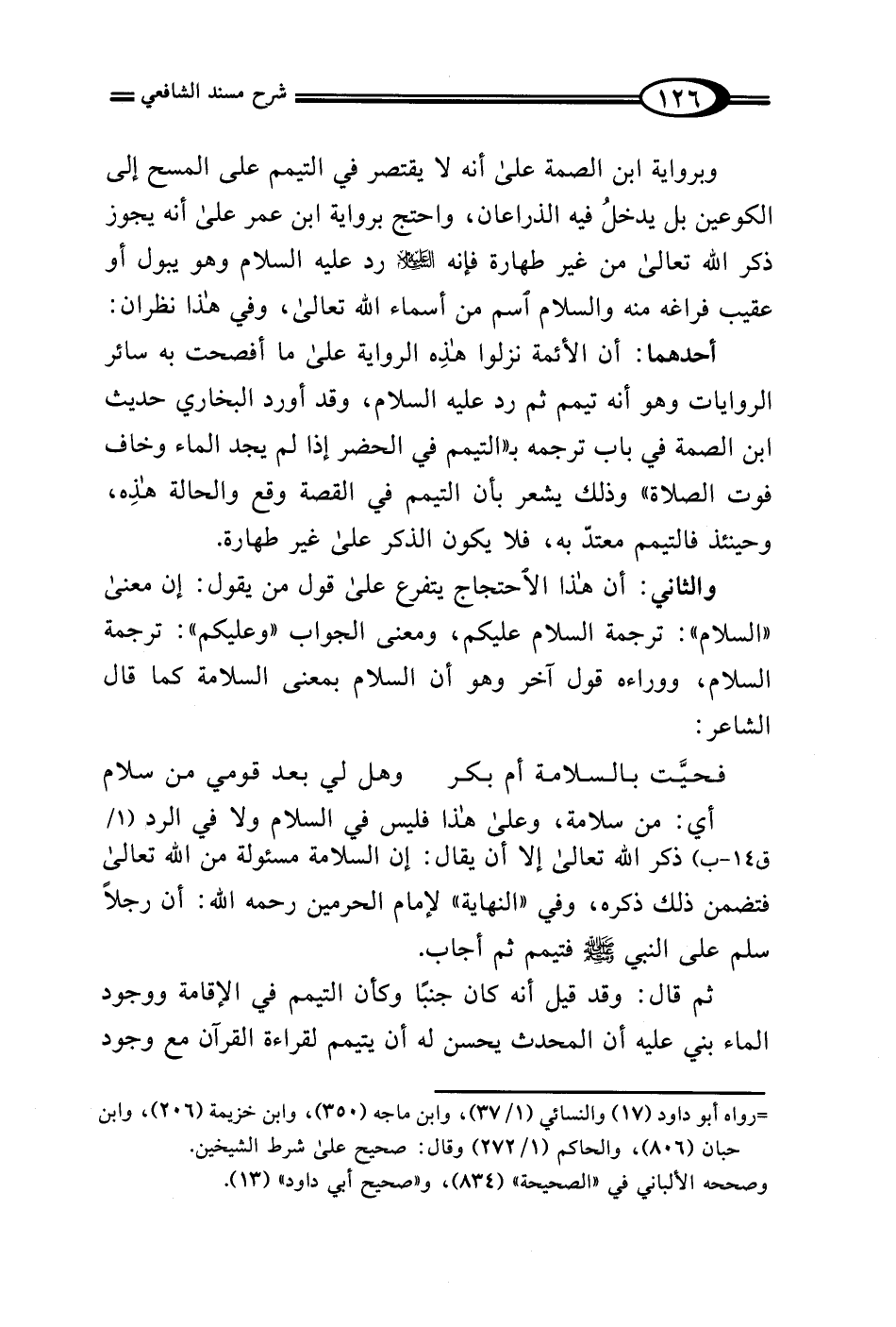 وبرواية ابن الصمة على أنه لا يقتصر في التيمم على المسح إلى الكوعين بل يدخلُ فيه الذراعان، واحتج برواية ابن عمر على أنه يجوز ذكر الله تعالى من غير طهارة فإنه - عليه السلام - رد عليه السلام وهو يبول أو عقيب فراغه منه والسلام اسم من أسماء الله تعالى، وفي هذا نظران: