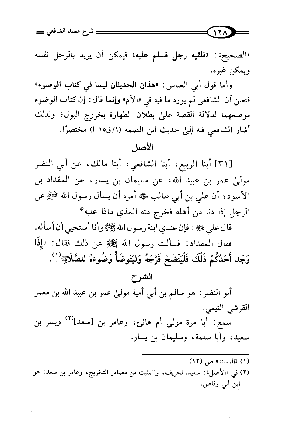 [31] أبنا الربيع، أبنا الشافعي، أبنا مالك، عن أبي النضر مولى عمر بن عبيد الله، عن سليمان بن يسار، عن المقداد بن الأسود؛ أن علي بن أبي طالب -رَضِيَ الله عَنْهُ- أمره أن يسأل رسول الله - صلى الله عليه وسلم - عن الرجل إذا دنا من أهله فخرج منه المذي ماذا عليه؟