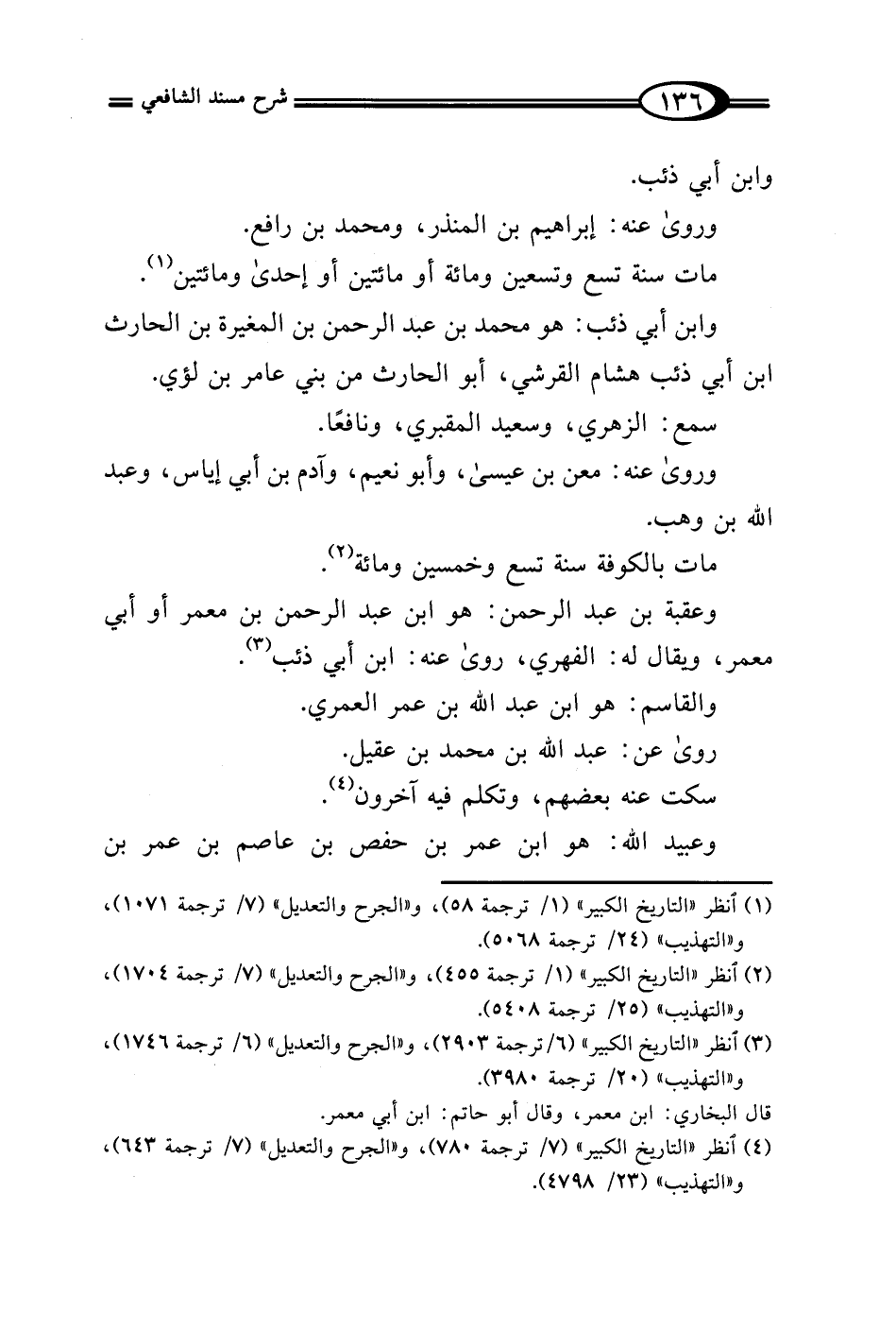 (¬2) انظر "التاريخ الكبير" (1/ ترجمة 455)، و"الجرح والتعديل" (7/ ترجمة 1704)، و"التهذيب" (25/ ترجمته 5408).