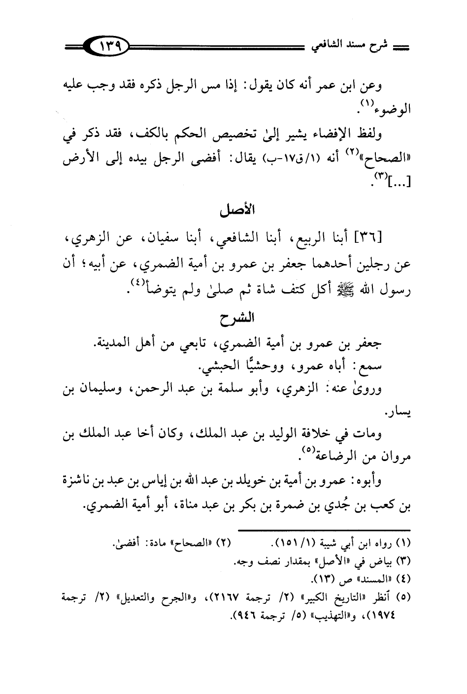 [36] أبنا الربيع، أبنا الشافعي، أبنا سفيان، عن الزهري، عن رجلين أحدهما جعفر بن عمرو بن أمية الضمري، عن أبيه؛ أن رسول الله - صلى الله عليه وسلم - أكل كتف شاة ثم صلى ولم يتوضأ (¬4).