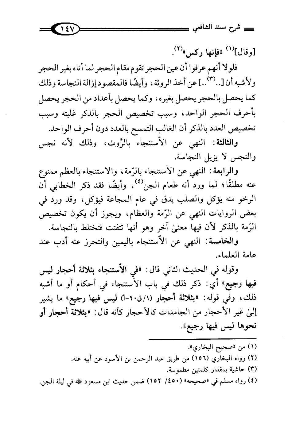 وقوله في الحديث الثاني قال: "في الاستنجاء بثلاثة أحجار ليس فيها رجيع، أي: ذكر ذلك في باب الاستنجاء في أحكام أو ما أشبه ذلك، وفي قوله: "بثلاثة أحجار (1/ ق 20 - أ) ليس فيها رجيع" ما يشير إلى غير الأحجار من الجامدات كالأحجار كأنه قال: "بثلاثة أحجار أو نحوها ليس فيها رجيع".