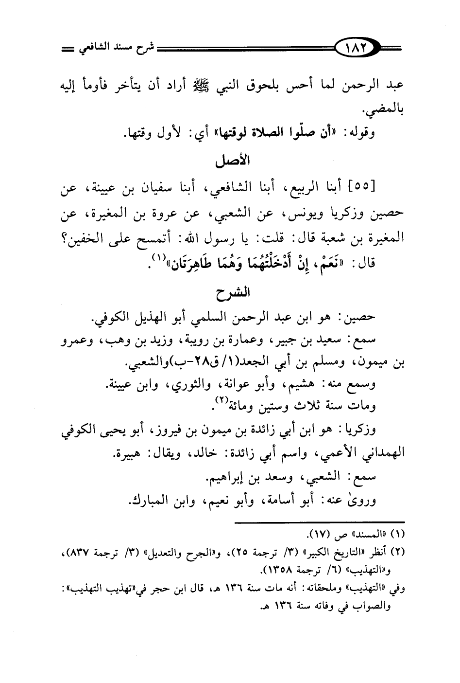 [55] أبنا الربيع، أبنا الشافعي، أبنا سفيان بن عيينة، عن حصين وزكريا ويونس، عن الشعبي، عن عروة بن المغيرة، عن المغيرة بن شعبة قال: قلت: يا رسول الله: أتمسح على الخفين؟ قال: "نَعَمْ، إِنْ أَدْخَلْتُهُمَا وَهُمَا طَاهِرَتَان" (¬1).