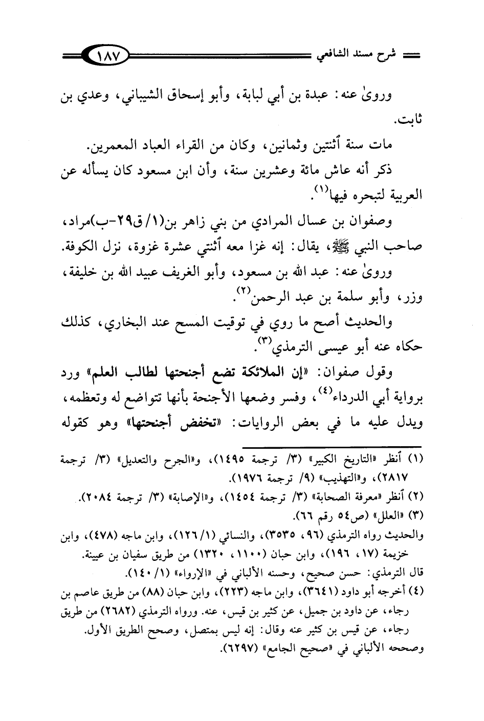 وقول صفوان: "إن الملائكة تضع أجنحتها لطالب العلم" ورد برواية أبي الدرداء (¬4)، وفسر وضعها الأجنحة بأنها تتواضع له وتعظمه، ويدل عليه ما في بعض الروايات: "تخفض أجنحتها" وهو كقوله