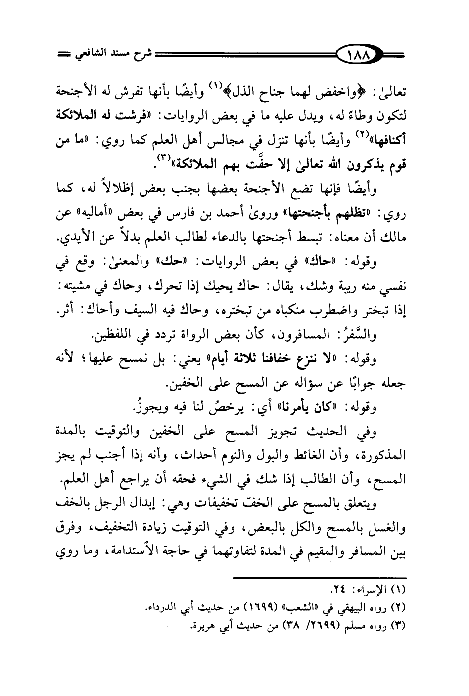 تعالى: {وَاخْفِضْ لَهُمَا جَنَاحَ الذُّلِّ} (¬1) وأيضًا بأنها تفرش له الأجنحة لتكون وطاءً له، ويدل عليه ما في بعض الروايات: "فرشت له الملائكة أكنافها" (¬2) وأيضًا بأنها تنزل في مجالس أهل العلم كما روي: "ما من قوم يذكرون الله تعالى إلا حفَّت بهم الملائكة" (¬3).