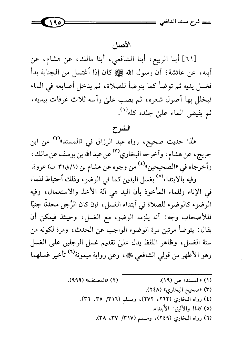 [61] أبنا الربيع، أبنا الشافعي، أبنا مالك، عن هشام، عن أبيه، عن عائشة؛ أن رسول الله - صلى الله عليه وسلم - كان إذا اغتسل من الجنابة بدأ فغسل يديه ثم توضأ كما يتوضأ للصلاة، ثم يدخل أصابعه في الماء فيخلل بها أصول شعره، ثم يصب على رأسه ثلاث غرفات بيديه، ثم يفيض الماء على جلده كله (¬1).
