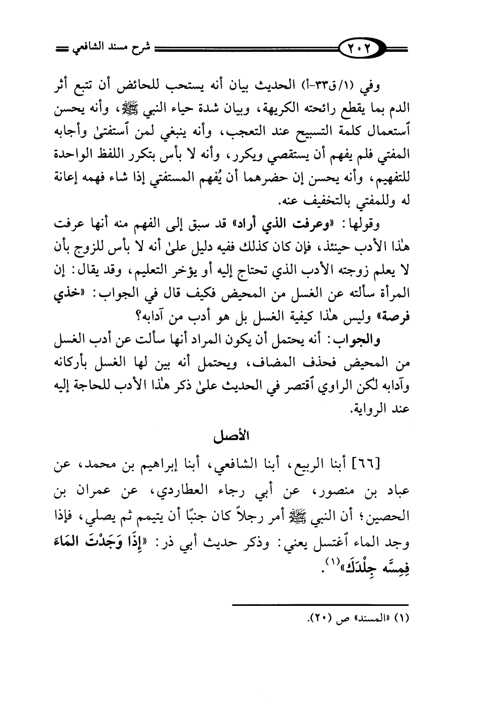 [66] أبنا الربيع، أبنا الشافعي، أبنا إبراهيم بن محمَّد، عن عباد بن منصور، عن أبي رجاء العطاردي، عن عمران بن الحصين؛ أن النبي - صلى الله عليه وسلم - أمر رجلًا كان جنبًا أن يتيمم ثم يصلي، فإذا وجد الماء اغتسل يعني: وذكر حديث أبي ذر: "إِذَا وَجَدْتَ المَاءَ فِمِسَّه جِلْدَكَ" (¬1).