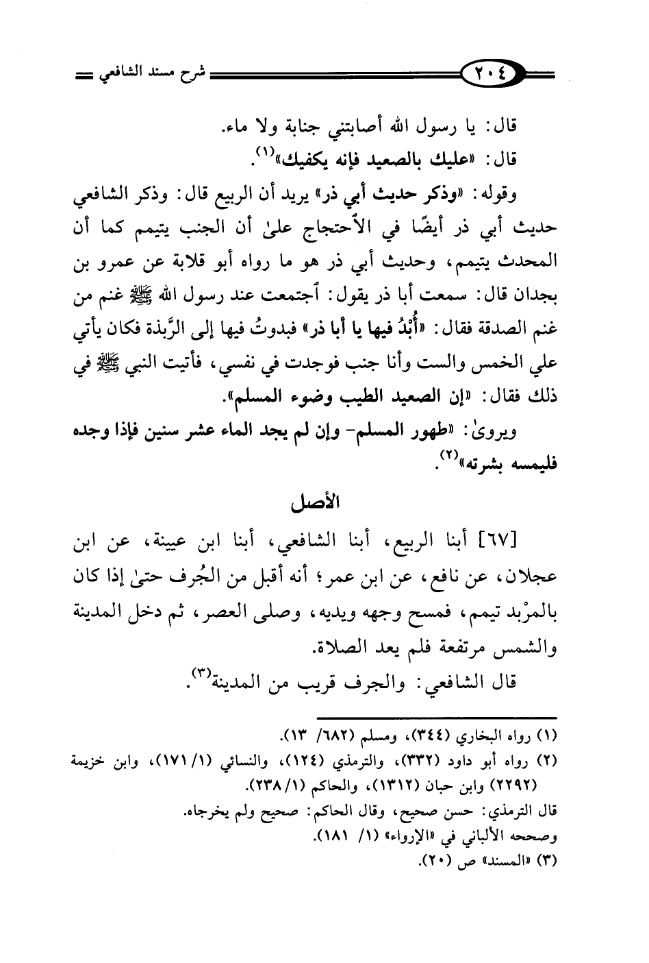 [67] أبنا الربيع، أبنا الشافعي، أبنا ابن عيينة، عن ابن عجلان، عن نافع، عن ابن عمر؛ أنه أقبل من الجُرف حتى إذا كان بالمرْبد تيمم، فمسح وجهه ويديه، وصلى العصر، ثم دخل المدينة والشمس مرتفعة فلم يعد الصلاة.