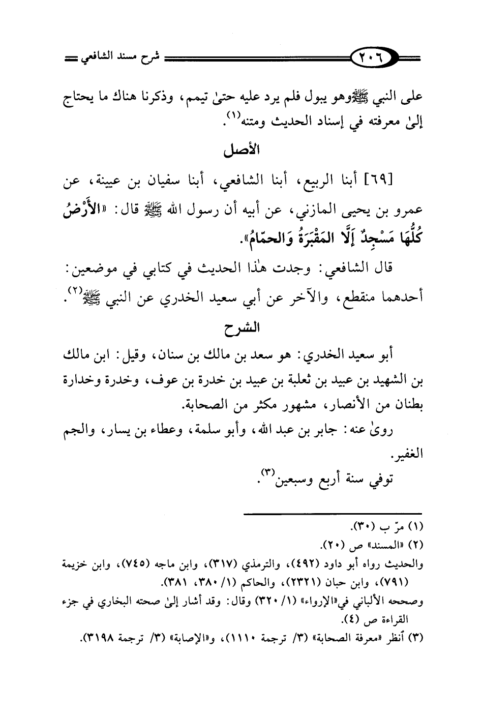 [69] أبنا الربيع، أبنا الشافعي، أبنا سفيان بن عيينة، عن عمرو بن يحيى المازني، عن أبيه أن رسول الله - صلى الله عليه وسلم - قال: "الأَرْضُ كُلُّهَا مَسْجِدٌ إَلَّا المَقْبَرَةُ وَالحمّامُ".