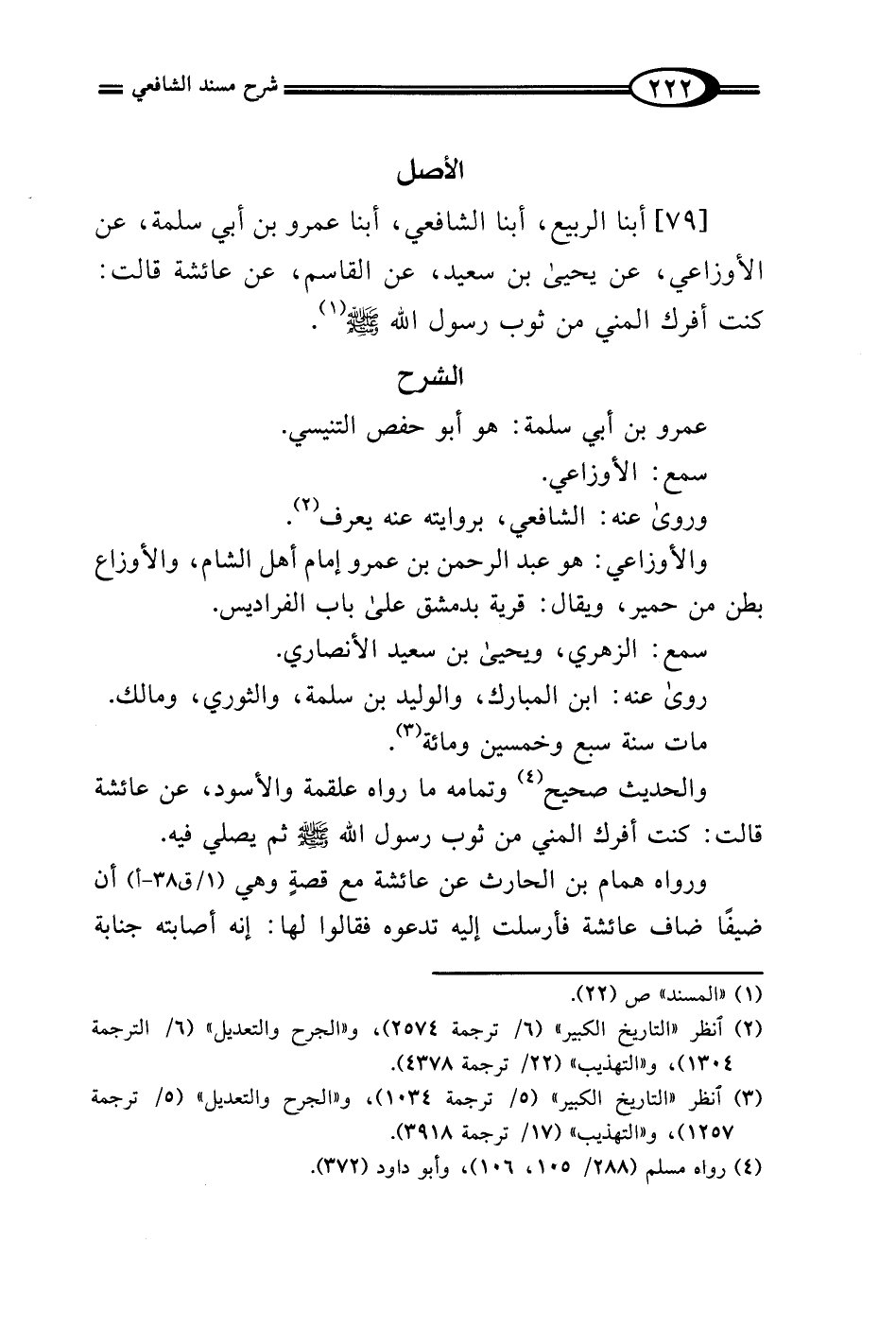 [79] أبنا الربيع، أبنا الشافعي، أبنا عمرو بن أبي سلمة، عن الأوزاعي، عن يحيى بن سعيد، عن القاسم، عن عائشة قالت: كنت أفرك المني من ثوب رسول الله - صلى الله عليه وسلم - (¬1).
