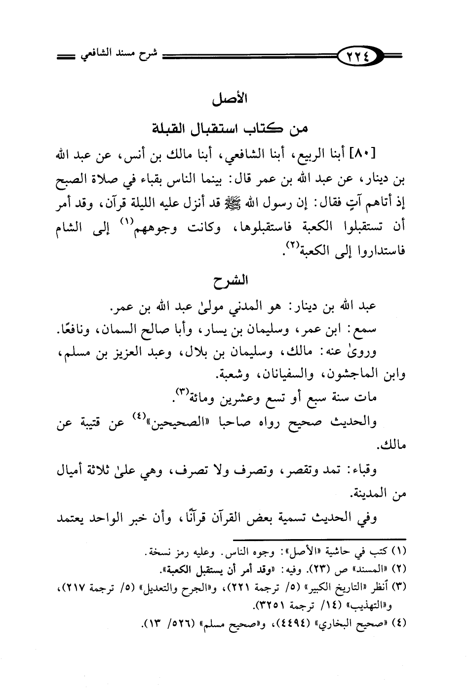 [80] أبنا الربيع، أبنا الشافعي، أبنا مالك بن أنس، عن عبد الله بن دينار، عن عبد الله بن عمر قال: بينما الناس بقباء في صلاة الصبح إذ أتاهم آتٍ فقال: إن رسول الله - صلى الله عليه وسلم - قد أنزل عليه الليلة قرآن، وقد أمر أن تستقبلوا الكعبة فاستقبلوها، وكانت وجوههم (¬1) إلى الشام فاستداروا إلى الكعبة (¬2).