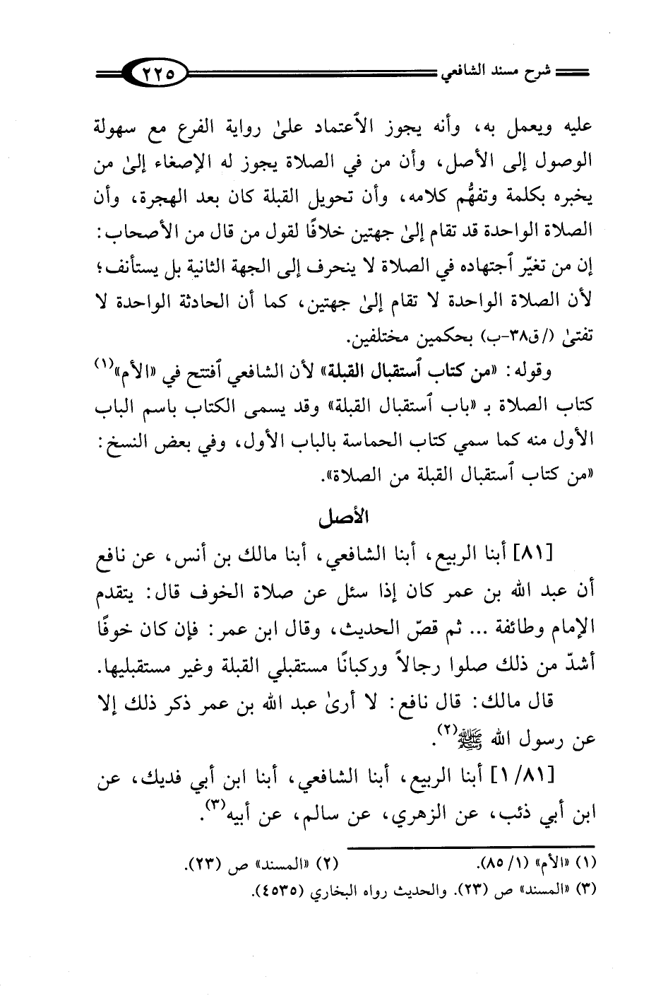 [81] أبنا الربيع، أبنا الشافعي، أبنا مالك بن أنس، عن نافع أن عبد الله بن عمر كان إذا سئل عن صلاة الخوف قال: يتقدم الإِمام وطائفة ... ثم قصّ الحديث، وقال ابن عمر: فإن كان خوفًا أشدّ من ذلك صلوا رجالًا وركبانًا مستقبلي القبلة وغير مستقبليها.