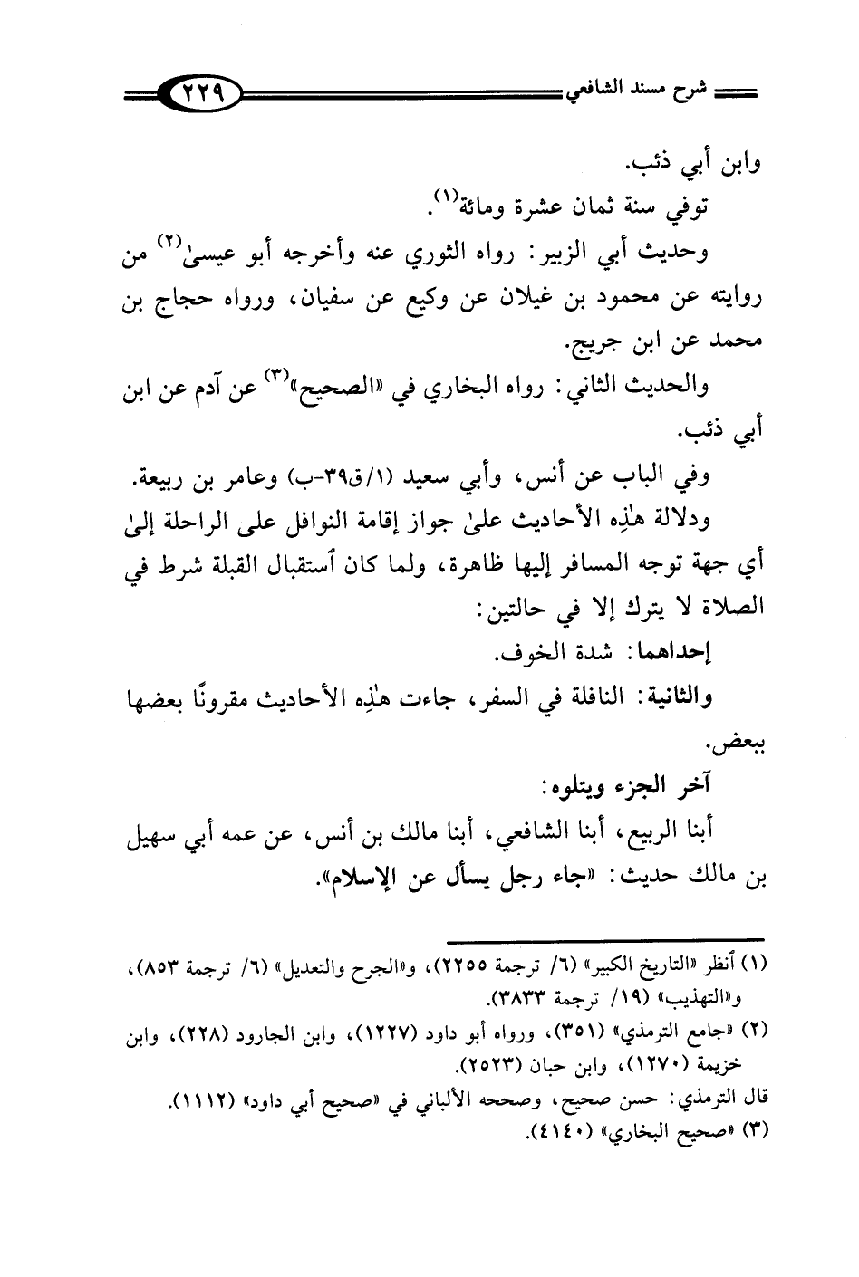 أبنا الربيع، أبنا الشافعي، أبنا مالك بن أنس، عن عمه أبي سهيل بن مالك حديث: "جاء رجل يسأل عن الإِسلام".