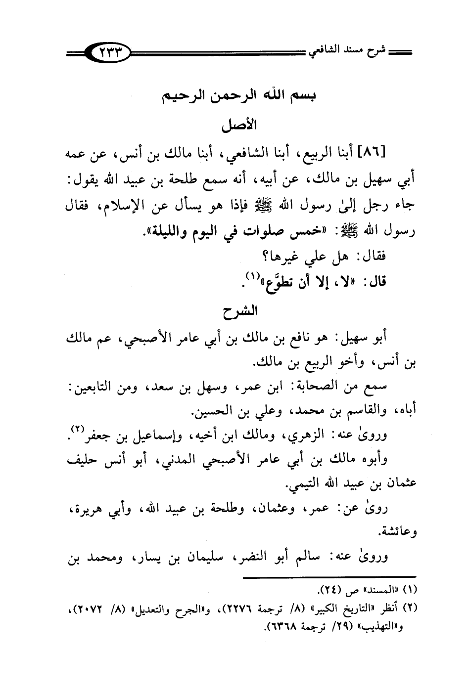 [86] أبنا الربيع، أبنا الشافعي، أبنا مالك بن أنس، عن عمه أبي سهيل بن مالك، عن أبيه، أنه سمع طلحة بن عبيد الله يقول: جاء رجل إلى رسول الله - صلى الله عليه وسلم - فإذا هو يسأل عن الإِسلام، فقال رسول الله - صلى الله عليه وسلم -: "خمس صلوات في اليوم والليلة".
