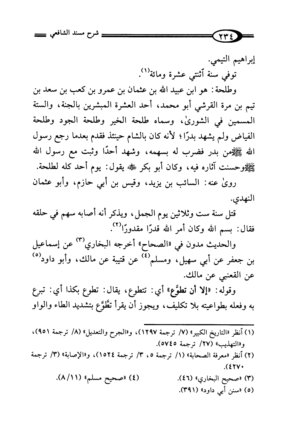 وطلحة: هو ابن عبيد الله بن عثمان بن عمرو بن كعب بن سعد بن تيم بن مرة القرشي أبو محمَّد، أحد العشرة المبشرين بالجنة، والستة المسمين في الشورى، وسماه طلحة الخير وطلحة الجود وطلحة الفياض ولم يشهد بدرًا؛ لأنه كان بالشام حينئذ فقدم بعدما رجع رسول الله - صلى الله عليه وسلم - من بدر فضرب له بسهمه، وشهد أحدًا وثبت مع رسول الله - صلى الله عليه وسلم - وحسنت آثاره فيه، وكان أبو بكر -رضي الله عنه - يقول: يوم أحد كله لطلحة.
