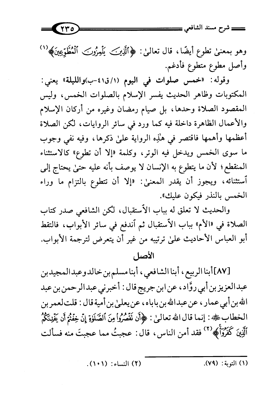 [87] أبنا الربيع، أبنا الشافعي، أبنا مسلم بن خالد وعبد المجيد بن عبد العزيز بن أبي روَّاد، عن ابن جريج قال: أخبرني عبد الرحمن بن عبد الله بن أبي عمار، عن عبد الله بن باباه، عن يعلى بن أمية قال: قلت لعمر بن الخطاب -رضي الله عنه -: إنما قال الله تعالى: {أَنْ تَقْصُرُوا مِنَ الصَّلَاةِ إِنْ خِفْتُمْ أَنْ يَفْتِنَكُمُ الَّذِينَ كَفَرُوا} (¬2) فقد أمن الناس، قال: عجبتُ مما عجبتَ منه فسألت