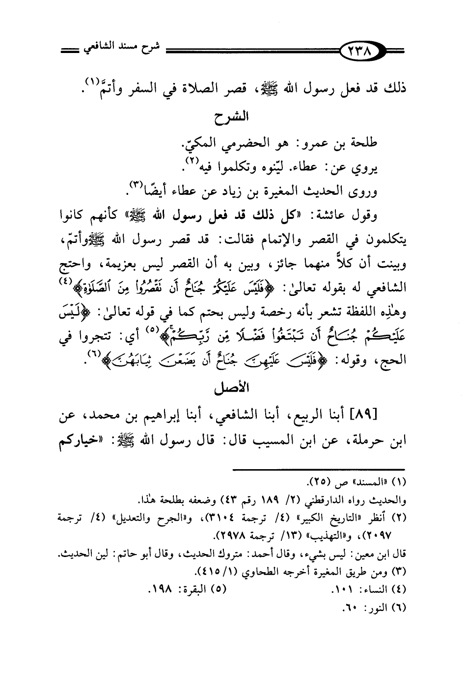 وقول عائشة: "كل ذلك قد فعل رسول الله - صلى الله عليه وسلم -" كأنهم كانوا يتكلمون في القصر والإتمام فقالت: قد قصر رسول الله - صلى الله عليه وسلم - وأتمّ، وبينت أن كلًّا منهما جائز، وبين به أن القصر ليس بعزيمة، واحتج الشافعي له بقوله تعالى: {فَلَيْسَ عَلَيْكُمْ جُنَاحٌ أَنْ تَقْصُرُوا مِنَ الصَّلَاةِ} (¬4) وهذِه اللفظة تشعر بأنه رخصة وليس بحتم كما في قوله تعالى: {لَيْسَ عَلَيْكُمْ جُنَاحٌ أَنْ تَبْتَغُوا فَضْلًا مِنْ رَبِّكُمْ} (¬5) أي: تتجروا في الحج، وقوله: {فَلَيْسَ عَلَيْهِنَّ جُنَاحٌ أَنْ يَضَعْنَ ثِيَابَهُنَّ} (¬6).