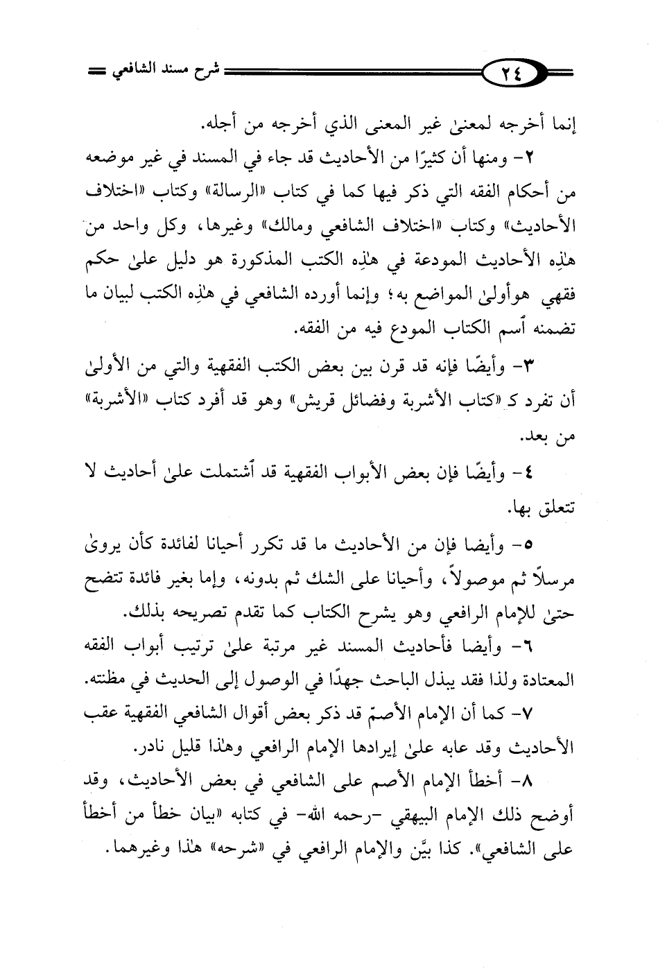 2 - ومنها أن كثيرًا من الأحاديث قد جاء في المسند في غير موضعه من أحكام الفقه التي ذكر فيها كما في كتاب "الرسالة" وكتاب "اختلاف الأحاديث" وكتاب "اختلاف الشافعي ومالك" وغيرها، وكل واحد من هذه الأحاديث المودعة في هذه الكتب المذكورة هو دليل على حكم فقهي هو أول المواضع به؛ وإنما أورده الشافعي في هذه الكتب لبيان ما تضمنه اسم الكتاب المودع فيه من الفقه.
