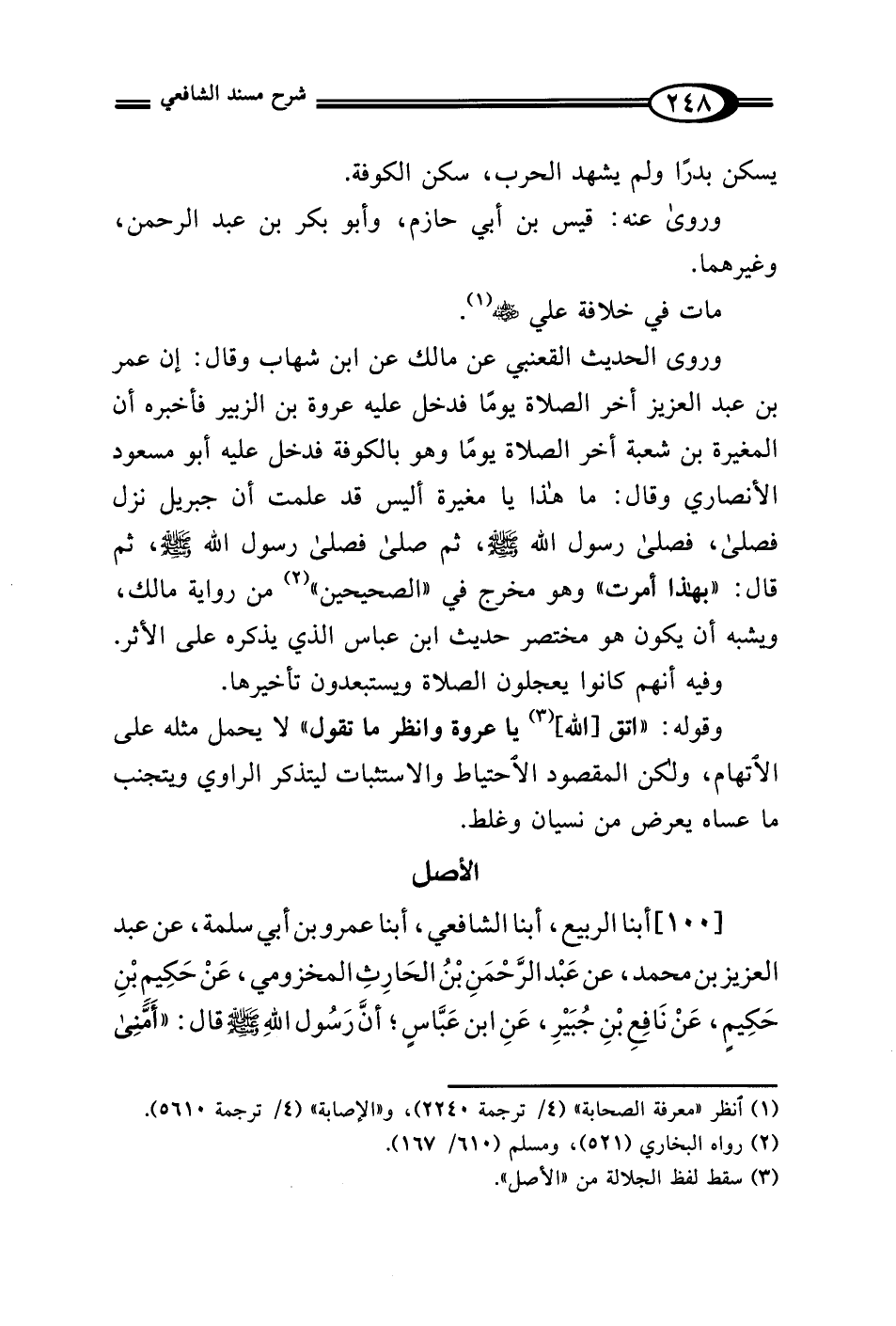 [100] أبنا الربيع، أبنا الشافعي، أبنا عمرو بن أبي سلمة، عن عبد العزيز بن محمَّد، عن عَبْد الرَّحْمَنِ بْنُ الحَارِثِ المخزومي، عَنْ حَكِيمِ بْنِ حَكِيمِ، عَنْ نَافِعِ بْنِ جُبَيْرِ، عَنِ ابن عَبَّاسٍ؛ أنَّ رَسُول اللهِ - صلى الله عليه وسلم - قال: "أَمَّنِي