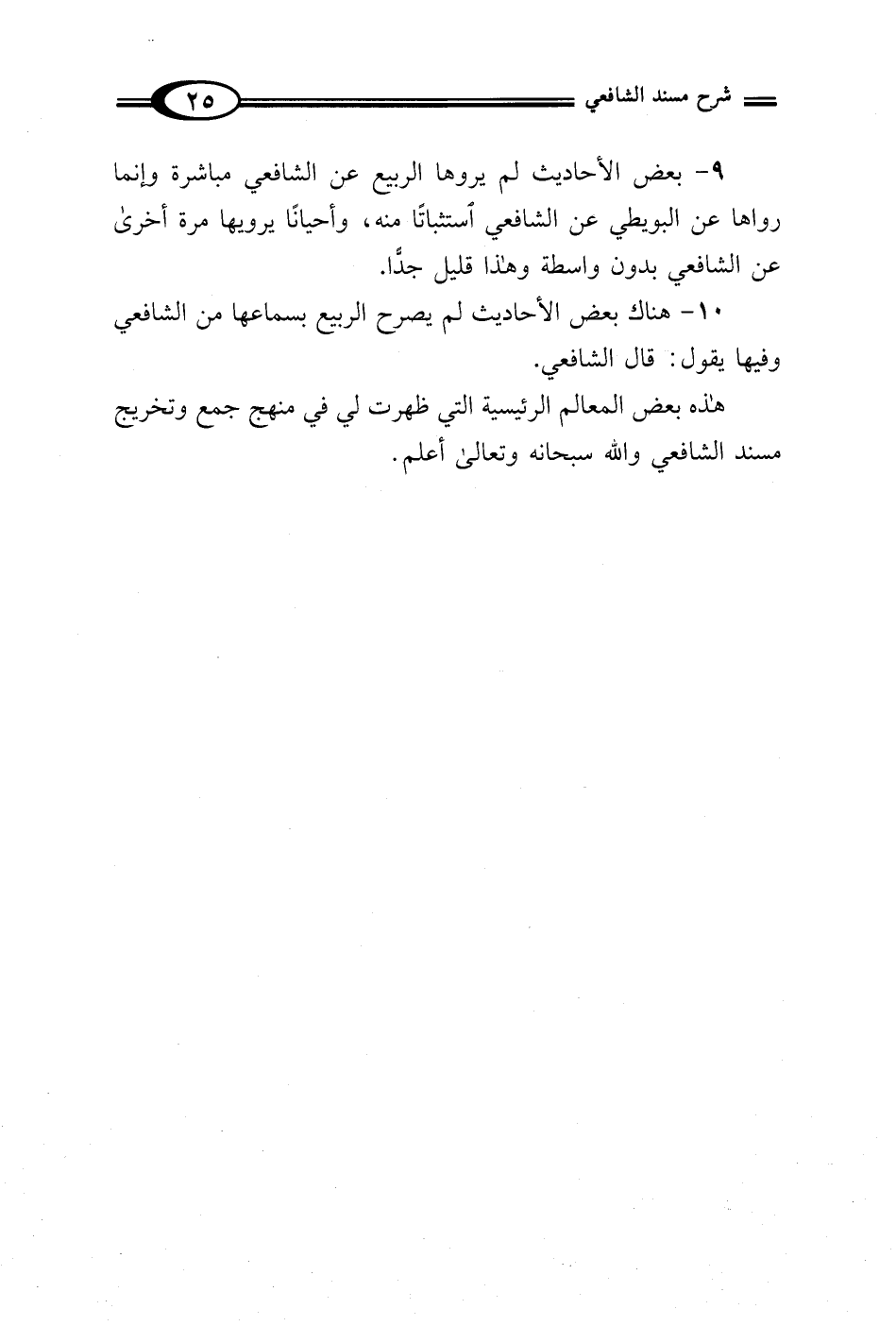 9 - بعض الأحاديث لم يروها الربيع عن الشافعي مباشرة وإنما رواها عن البويطي عن الشافعي استثباتًا منه، وأحيانًا يرويها مرة أخرى عن الشافعي بدون واسطة وهذا قليل جدًّا.