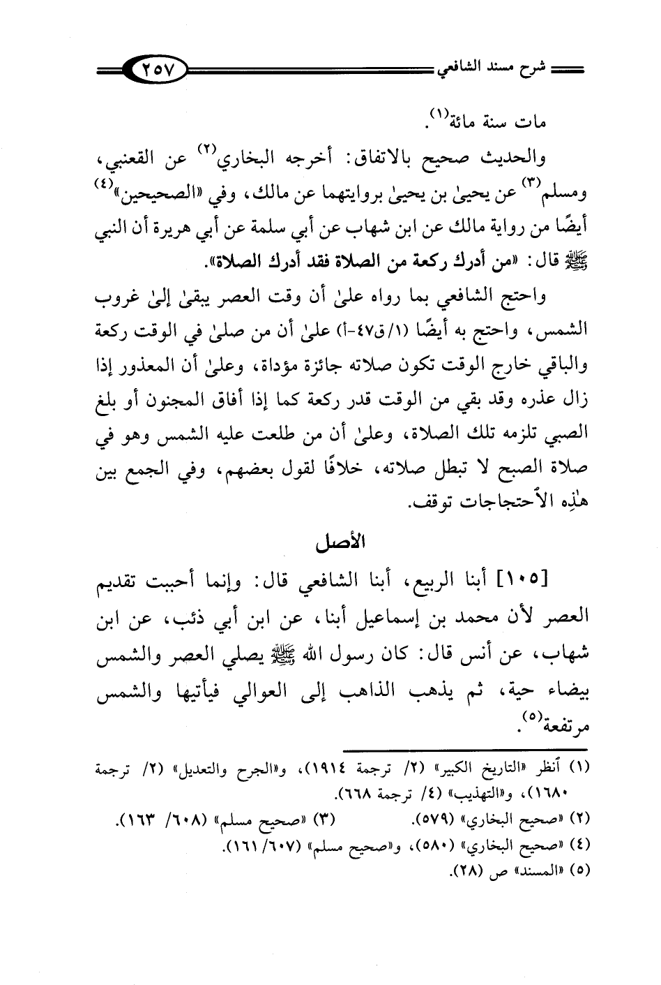 [105] أبنا الربيع، أبنا الشافعي قال: وإنما أحببت تقديم العصر لأن محمَّد بن إسماعيل أبنا، عن ابن أبي ذئب، عن ابن شهاب، عن أنس قال: كان رسول الله - صلى الله عليه وسلم - يصلي العصر والشمس بيضاء حية، ثم يذهب الذاهب إلى العوالي فيأتيها والشمس مرتفعة (¬5).