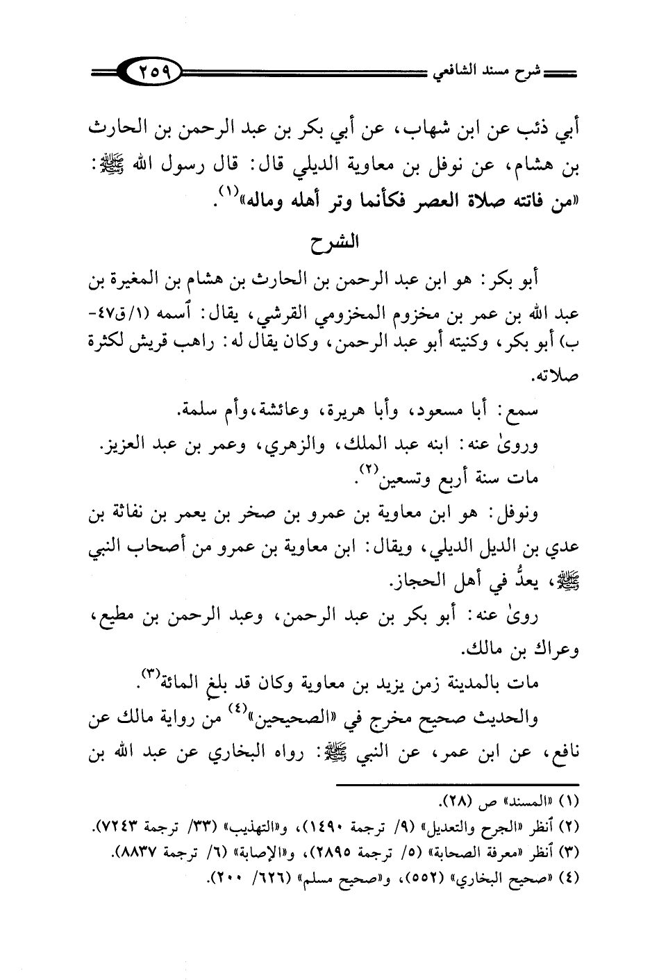 أبي ذئب عن ابن شهاب، عن أبي بكر بن عبد الرحمن بن الحارث بن هشام، عن نوفل بن معاوية الديلي قال: قال رسول الله - صلى الله عليه وسلم -: "من فاتته صلاة العصر فكأنما وتر أهله وماله" (¬1).