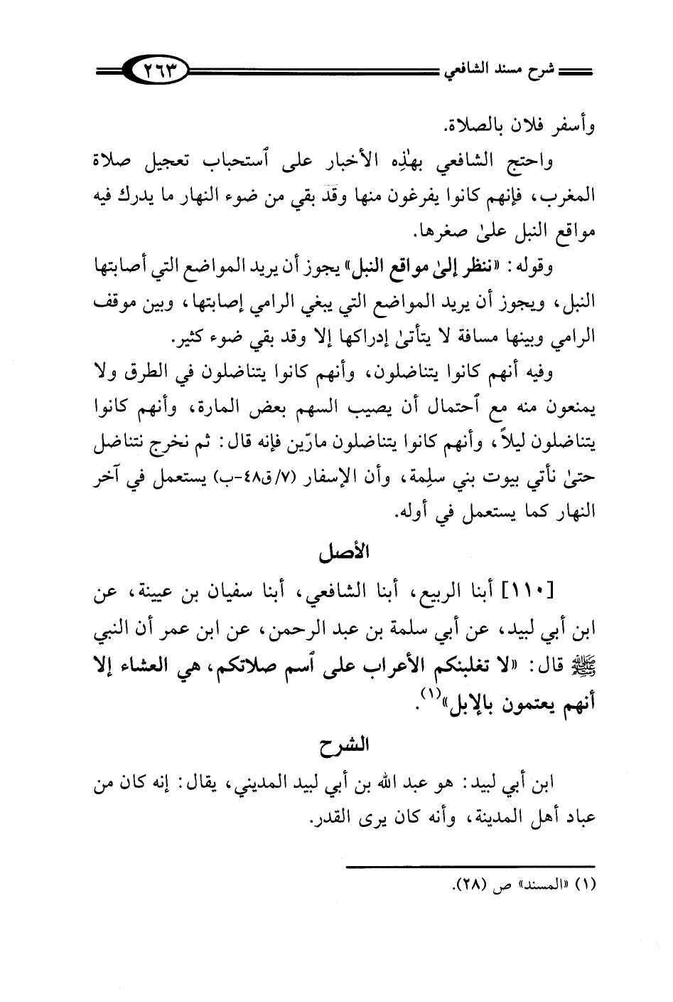 [110] أبنا الربيع، أبنا الشافعي، أبنا سفيان بن عيينة، عن ابن أبي لبيد، عن أبي سلمة بن عبد الرحمن، عن ابن عمر أن النبي - صلى الله عليه وسلم - قال: "لا تغلبنكم الأعراب على اسم صلاتكم، هي العشاء إلا أنهم يعتمون بالإبل" (¬1).