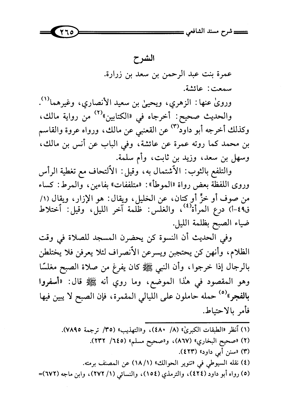 وفي الحديث أن النسوة كن يحضرن المسجد للصلاة في وقت الظلام، وأنهن كن يحتجبن ويسرعن الانصراف لئلا يعرفن فلا يختلطن بالرجال إذا خرجوا، وأن النبي - صلى الله عليه وسلم - كان يفرغ من صلاة الصبح مغلسًا وهو المقصود في هذا الموضع، وما روي أنه - صلى الله عليه وسلم - قال: "أسفروا بالفجر" (¬5) حمله حاملون على الليالي المقمرة، فإن الصبح لا يبين فيها فأمر بالاحتياط.