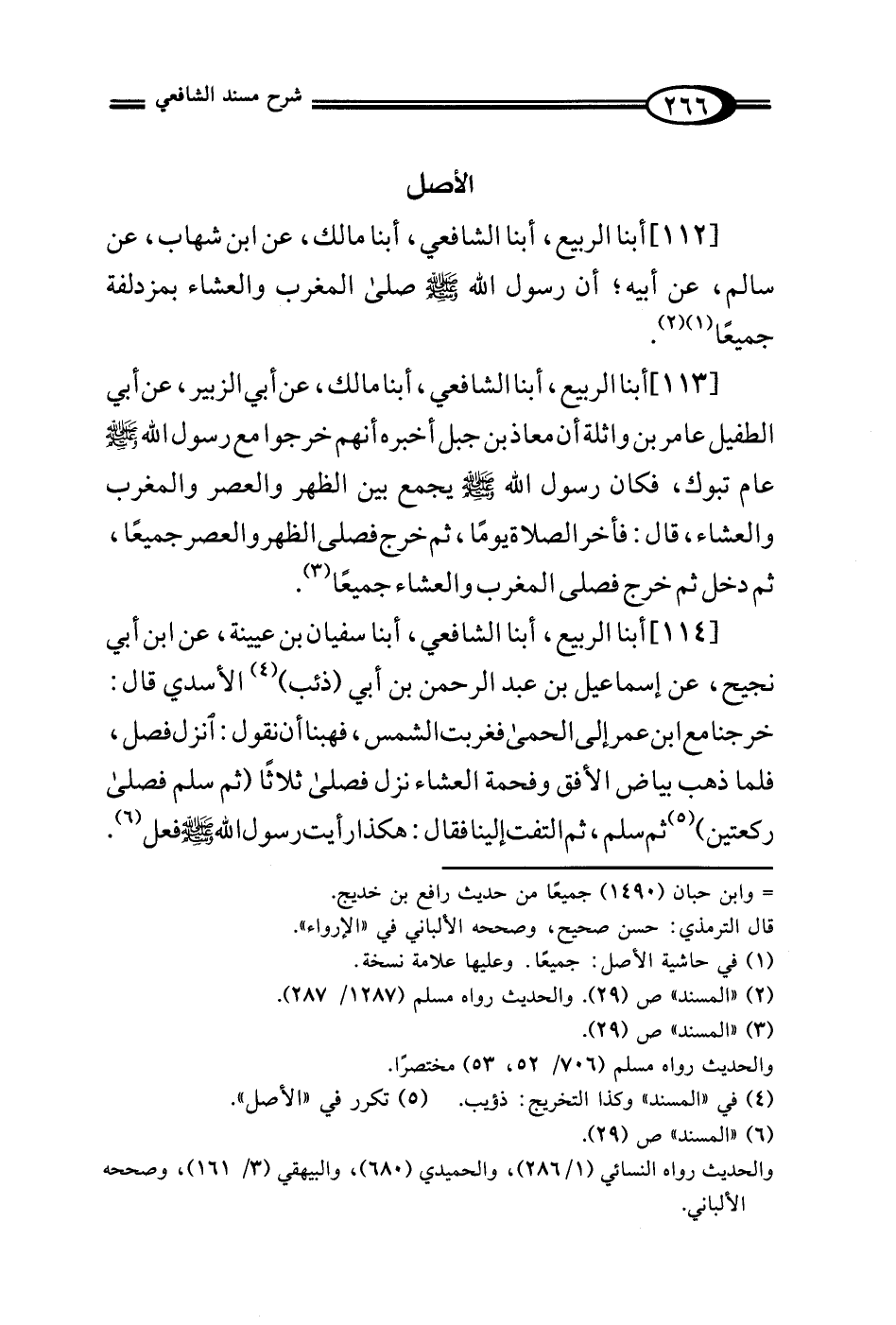 [113] أبنا الربيع، أبنا الشافعي، أبنا مالك، عن أبي الزبير، عن أبي الطفيل عامر بن واثلة أن معاذ بن جبل أخبره أنهم خرجوا مع رسول الله - صلى الله عليه وسلم - عام تبوك، فكان رسول الله - صلى الله عليه وسلم - يجمع بين الظهر والعصر والمغرب والعشاء، قال: فأخر الصلاة يومًا، ثم خرج فصلى الظهر والعصر جميعًا، ثم دخل ثم خرج فصلى المغرب والعشاء جميعًا (¬3).
