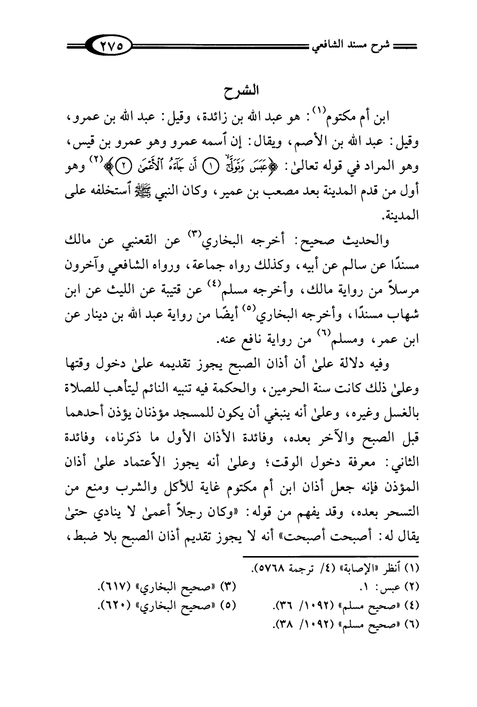 ابن أم مكتوم (¬1): هو عبد الله بن زائدة، وقيل: عبد الله بن عمرو، وقيل: عبد الله بن الأصم، ويقال: إن اسمه عمرو وهو عمرو بن قيس، وهو المراد في قوله تعالى: {عَبَسَ وَتَوَلَّى (1) أَنْ جَاءَهُ الْأَعْمَى (2)} (¬2) وهو أول من قدم المدينة بعد مصعب بن عمير، وكان النبي - صلى الله عليه وسلم - استخلفه على المدينة.