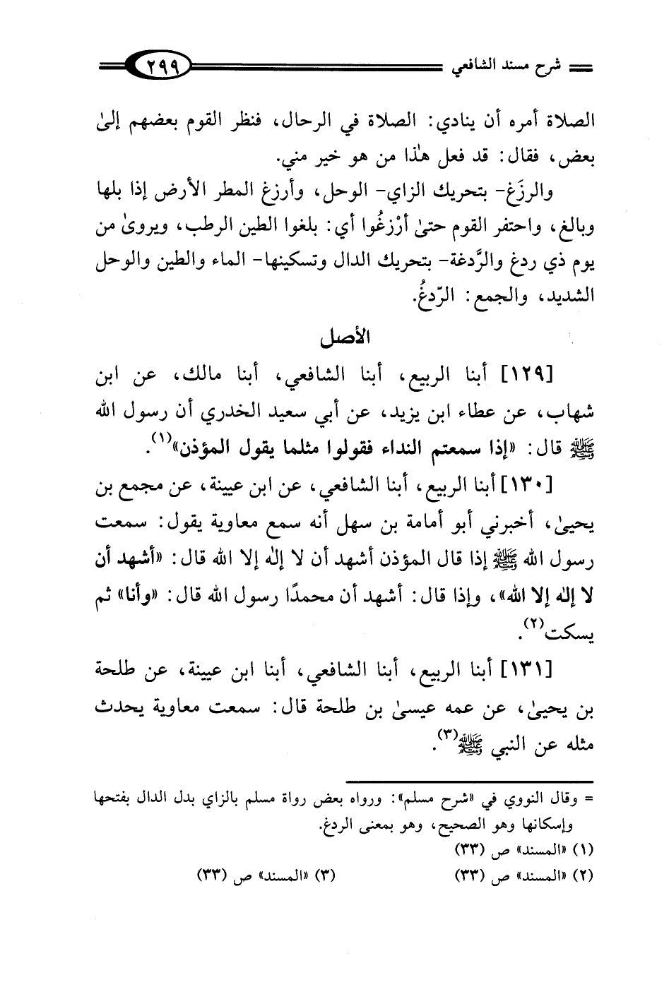 [129] أبنا الربيع، أبنا الشافعي، أبنا مالك، عن ابن شهاب، عن عطاء ابن يزيد، عن أبي سعيد الخدري أن رسول الله - صلى الله عليه وسلم - قال: "إذا سمعتم النداء فقولوا مثلما يقول المؤذن" (¬1).