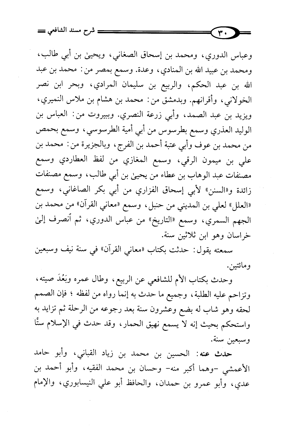 وحدث بكتاب الأم للشافعي عن الربيع، وطال عمره وبَعُدَ صيته، وتزاحم عليه الطلبة، وجميع ما حدث به إنما رواه من لفظه؛ فإن الصمم لحقه وهو شاب له بضع وعشرون سنة بعد رجوعه من الرحلة ثم تزايد به واستحكم بحيث إنه لا يسمع نهيق الحمار، وقد حدث في الإِسلام ستًّا وسبعين سنة.