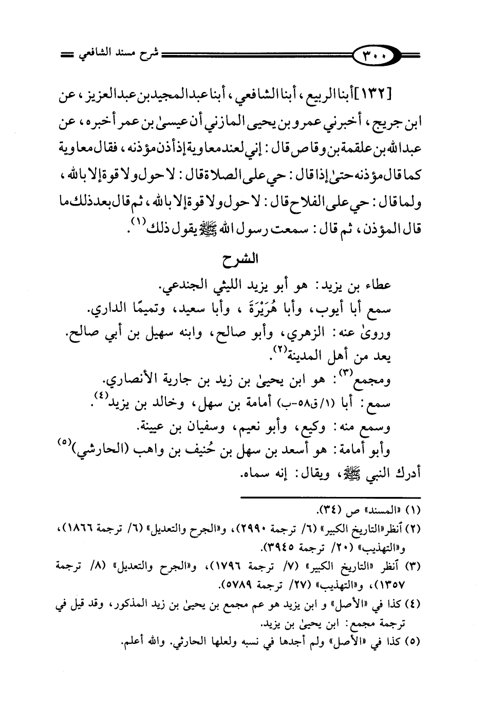 [132] أبنا الربيع، أبنا الشافعي، أبنا عبد المجيد بن عبد العزيز، عن ابن جريج، أخبرني عمرو بن يحيى المازني أن عيسى بن عمر أخبره، عن عبد الله بن علقمة بن وقاص قال: إني لعند معاوية إذ أذن مؤذنه، فقال معاوية كما قال مؤذنه حتى إذا قال: حي على الصلاة قال: لا حول ولا قوة إلا بالله، ولما قال: حي على الفلاح قال: لا حول ولا قوة إلا بالله، ثم قال بعد ذلك ما قال المؤذن، ثم قال: سمعت رسول الله - صلى الله عليه وسلم - يقول ذلك (¬1).