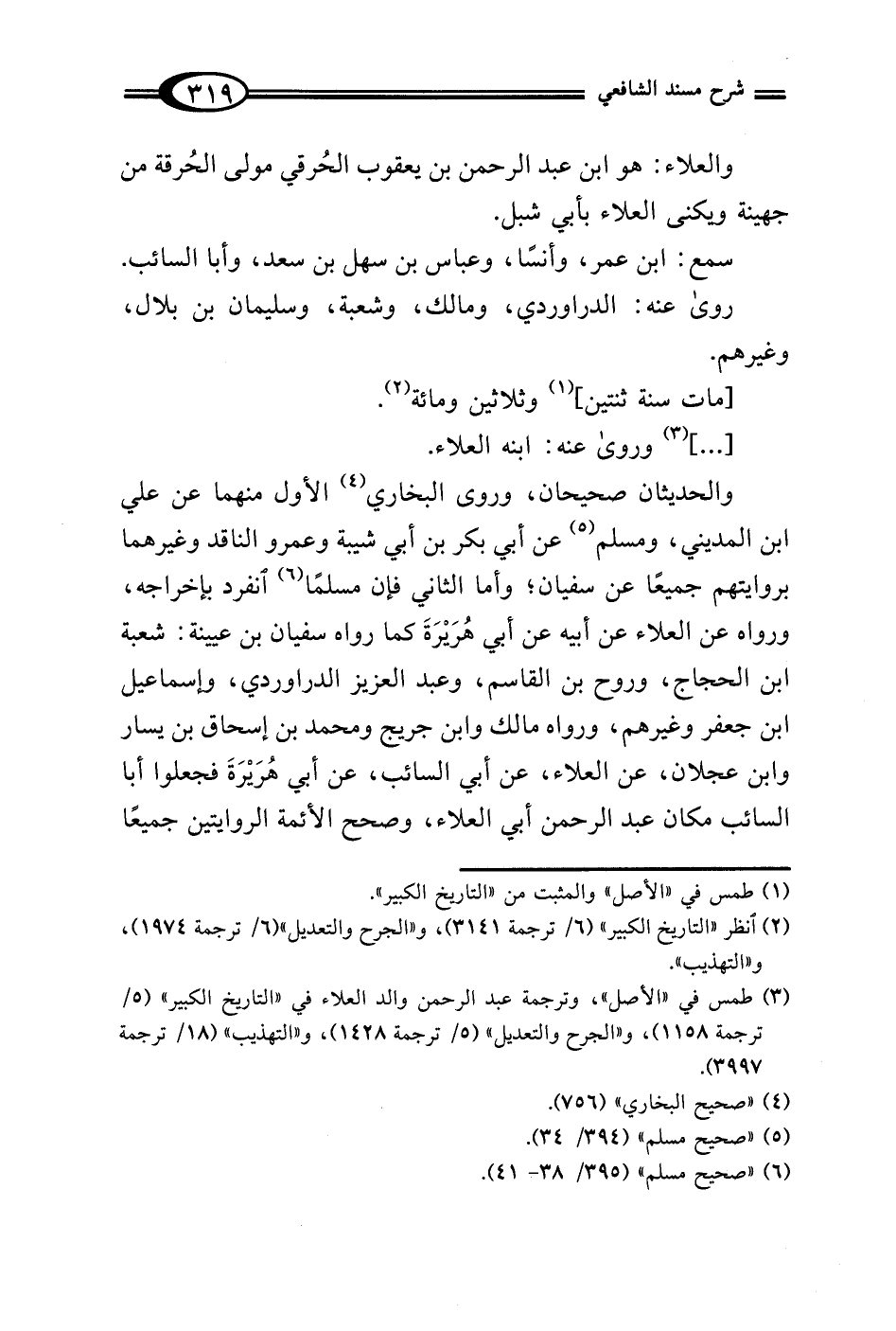 والعلاء: هو ابن عبد الرحمن بن يعقوب الحُرقي مولى الحُرقة من جهينة ويكنى العلاء بأبي شبل.