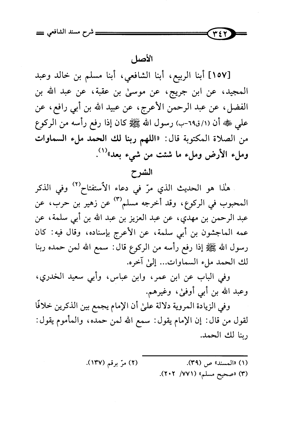 [157] أبنا الربيع، أبنا الشافعي، أبنا مسلم بن خالد وعبد المجيد، عن ابن جريج، عن موسى بن عقبة، عن عبد الله بن الفضل، عن عبد الرحمن الأعرج، عن عبيد الله بن أبي رافع، عن علي -رضي الله عنه- أن (1/ ق 69 - ب) رسول الله - صلى الله عليه وسلم - كان إذا رفع رأسه من الركوع من الصلاة المكتوبة قال: "اللهم ربنا لك الحمد ملء السماوات وملء الأرض وملء ما شئت من شيء بعد" (¬1).