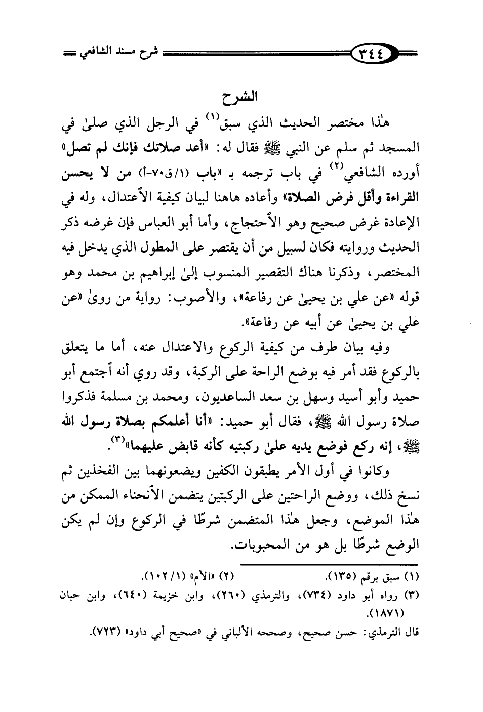 هذا مختصر الحديث الذي سبق (¬1) في الرجل الذي صلى في المسجد ثم سلم عن النبي - صلى الله عليه وسلم - فقال له: "أعد صلاتك فإنك لم تصل" أورده الشافعي (¬2) في باب ترجمه بـ "باب (1/ ق 70 - أ) من لا يحسن القراءة وأقل فرض الصلاة" وأعاده ها هنا لبيان كيفية الاعتدال، وله في الإعادة غرض صحيح وهو الاحتجاج، وأما أبو العباس فإن غرضه ذكر الحديث وروايته فكان لسبيل من أن يقتصر على المطول الذي يدخل فيه المختصر، وذكرنا هناك التقصير المنسوب إلى إبراهيم بن محمَّد وهو قوله "عن علي بن يحيى عن رفاعة"، والأصوب: رواية من روى "عن علي بن يحيى عن أبيه عن رفاعة".