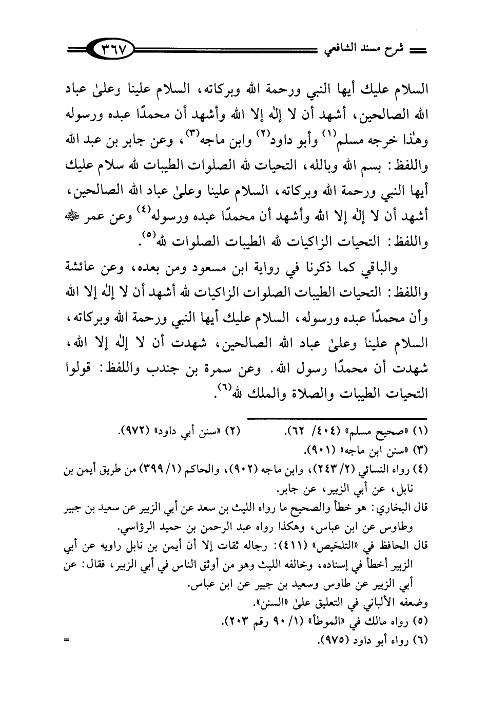 السلام عليك أيها النبي ورحمة الله وبركاته، السلام علينا وعلى عباد الله الصالحين، أشهد أن لا إلله إلا الله وأشهد أن محمدًا عبده ورسوله وهذا خرجه مسلم (¬1) وأبو داود (¬2) وابن ماجه (¬3)، وعن جابر بن عبد الله واللفظ: بسم الله وبالله، التحيات لله الصلوات الطيبات لله سلام عليك أيها النبي ورحمة الله وبركاته، السلام علينا وعلى عباد الله الصالحين، أشهد أن لا إله إلا الله وأشهد أن محمدًا عبده ورسوله (¬4) وعن عمر -رضي الله عنه- واللفظ: التحيات الزاكيات لله الطيبات الصلوات لله (¬5).