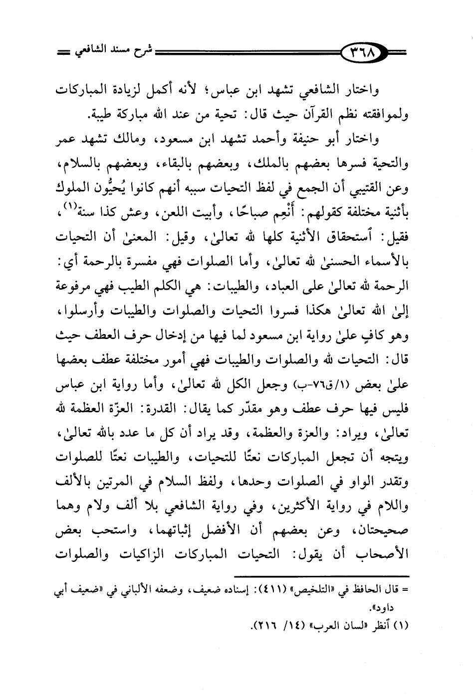 واختار أبو حنيفة وأحمد تشهد ابن مسعود، ومالك تشهد عمر والتحية فسرها بعضهم بالملك، وبعضهم بالبقاء، وبعضهم بالسلام، وعن القتيبي أن الجمع في لفظ التحيات سببه أنهم كانوا يُحيُّون الملوك بأثنية مختلفة كقولهم: أَنْعِم صباحًا، وأبيت اللعن، وعش كذا سنة (¬1)، فقيل: استحقاق الأثنية كلها لله تعالى، وقيل: المعنى أن التحيات بالأسماء الحسنى لله تعالى، وأما الصلوات فهي مفسرة بالرحمة أي: الرحمة لله تعالى على العباد، والطيبات: هي الكلم الطيب فهي مرفوعة إلى الله تعالى هكذا فسروا التحيات والصلوات والطيبات وأرسلوا، وهو كافٍ على رواية ابن مسعود لما فيها من إدخال حرف العطف حيث قال: التحيات لله والصلوات والطيبات فهي أمور مختلفة عطف بعضها على بعض (1/ ق 76 - ب) وجعل الكل لله تعالى، وأما رواية ابن عباس فليس فيها حرف عطف وهو مقدّر كما يقال: القدرة: العزّة العظمة لله تعالى، ويراد: والعزة والعظمة، وقد يراد أن كل ما عدد بالله تعالى، ويتجه أن تجعل المباركات نعتًا للتحيات، والطيبات نعتًا للصلوات وتقدر الواو في الصلوات وحدها، ولفظ السلام في المرتين بالألف والسلام في رواية الأكثرين، وفي رواية الشافعي بلا ألف ولام وهما صحيحتان، وعن بعضهم أن الأفضل إثباتهما، واستحب بعض الأصحاب أن يقول: التحيات المباركات الزاكيات والصلوات