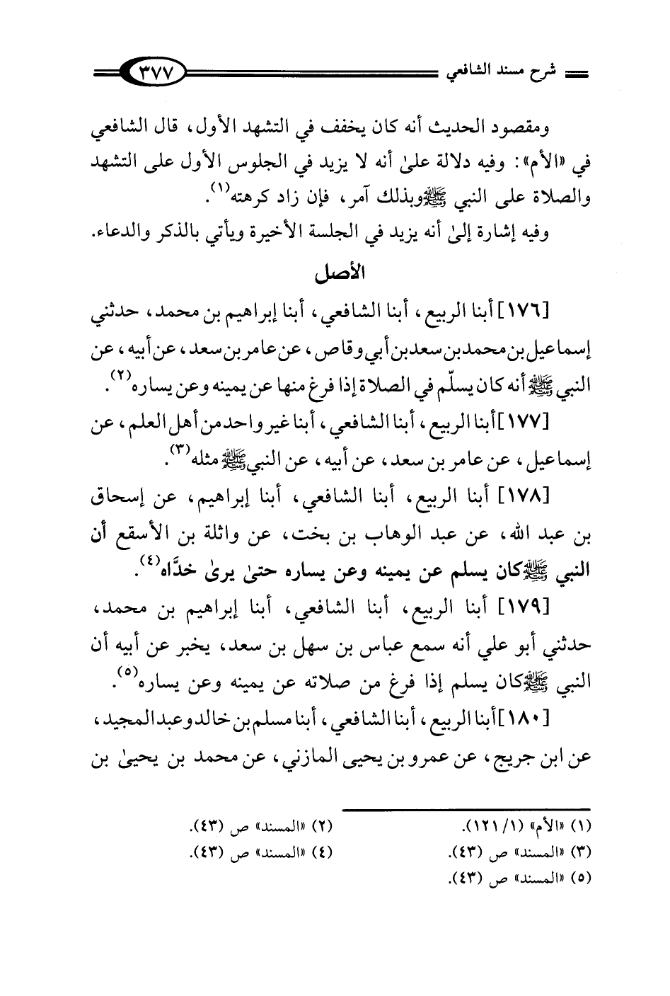 [176] أبنا الربيع، أبنا الشافعي، أبنا إبراهيم بن محمَّد، حدثني إسماعيل بن محمَّد بن سعد بن أبي وقاص، عن عامر بن سعد، عن أبيه، عن النبي - صلى الله عليه وسلم - أنه كان يسلّم في الصلاة إذا فرغ منها عن يمينه وعن يساره (¬2).