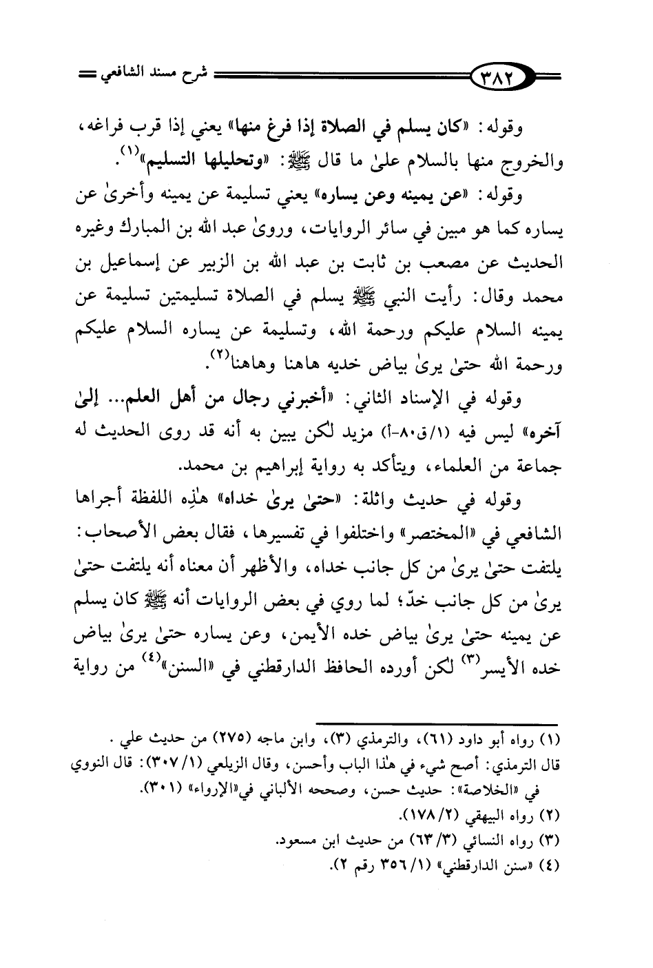 وقوله في حديث واثلة: "حتى يرى خداه" هذِه اللفظة أجراها الشافعي في "المختصر" واختلفوا في تفسيرها، فقال بعض الأصحاب: يلتفت حتى يرى من كل جانب خداه، والأظهر أن معناه أنه يلتفت حتى يرى من كل جانب خدّ؛ لما روي في بعض الروايات أنه - صلى الله عليه وسلم - كان يسلم عن يمينه حتى يرى بياض خده الأيمن، وعن يساره حتى يرى بياض خده الأيسر (¬3) لكن أورده الحافظ الدارقطني في "السنن" (¬4) من رواية