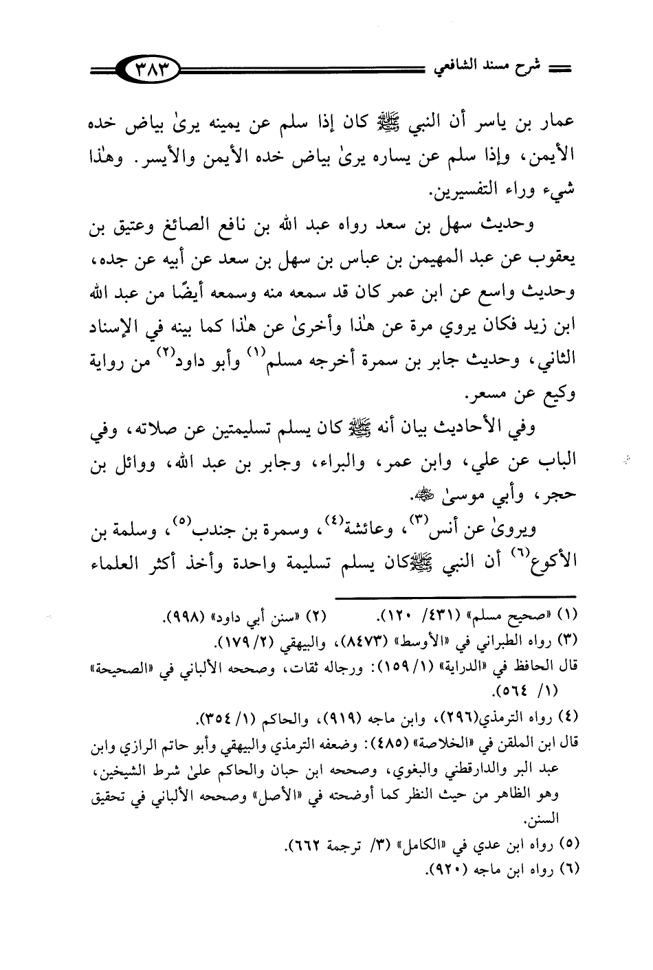 عمار بن ياسر أن النبي - صلى الله عليه وسلم - كان إذا سلم عن يمينه يرى بياض خده الأيمن، وإذا سلم عن يساره يرى بياض خده الأيمن والأيسر. وهذا شيء وراء التفسيرين.