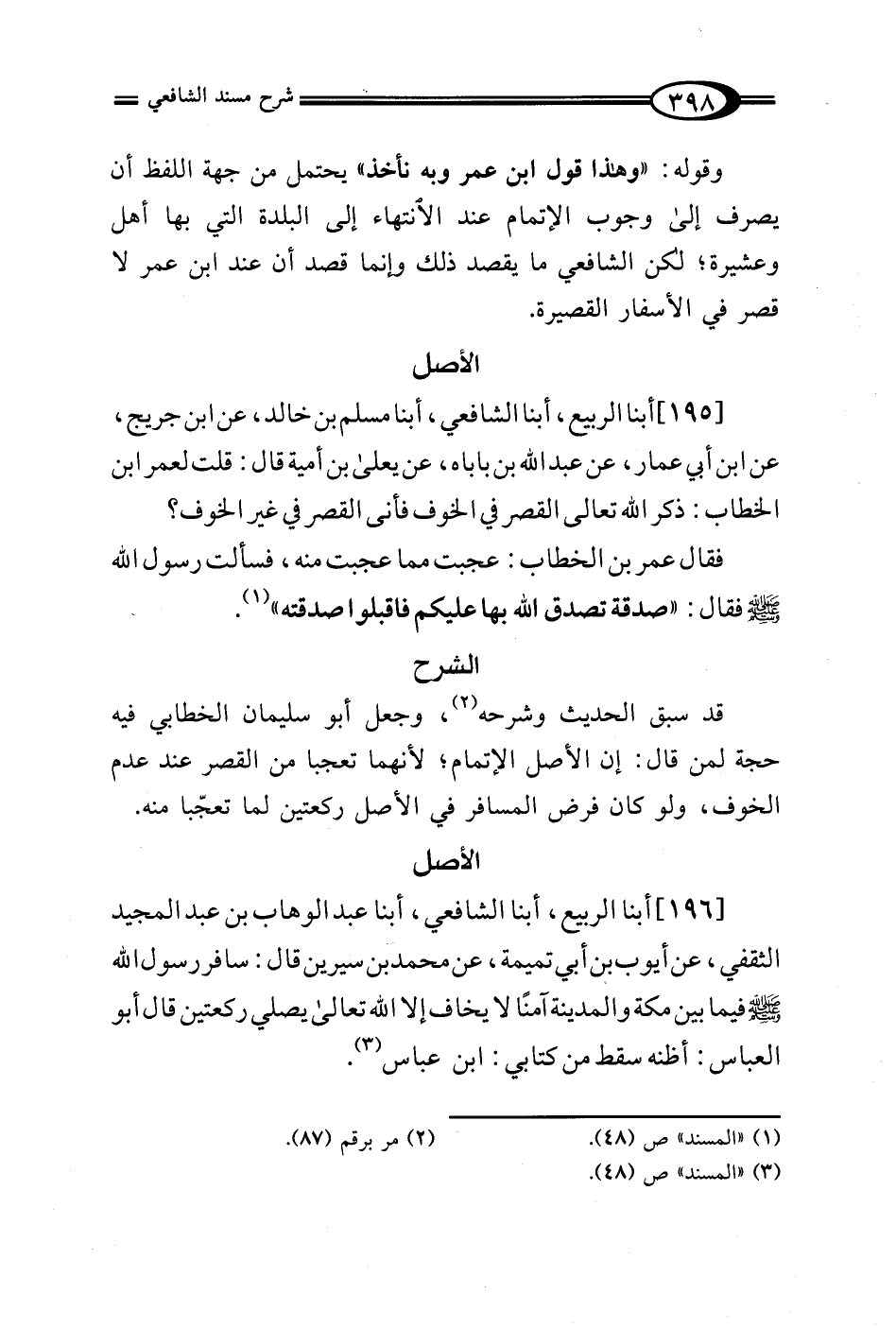 [195] أبنا الربيع، أبنا الشافعي، أبنا مسلم بن خالد، عن ابن جريج، عن ابن أبي عمار، عن عبد الله بن باباه، عن يعلى بن أمية قال: قلت لعمر ابن الخطاب: ذكر الله تعالى القصر في الخوف فأنى القصر في غير الخوف؟