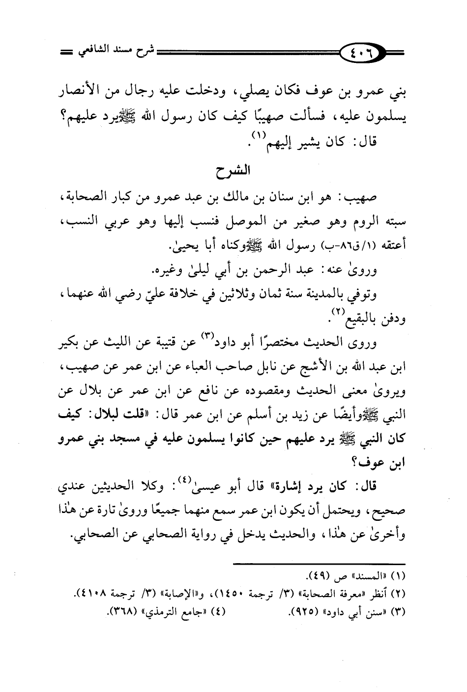بني عمرو بن عوف فكان يصلي، ودخلت عليه رجال من الأنصار يسلمون عليه، فسألت صهيبًا كيف كان رسول الله - صلى الله عليه وسلم - يرد عليهم؟