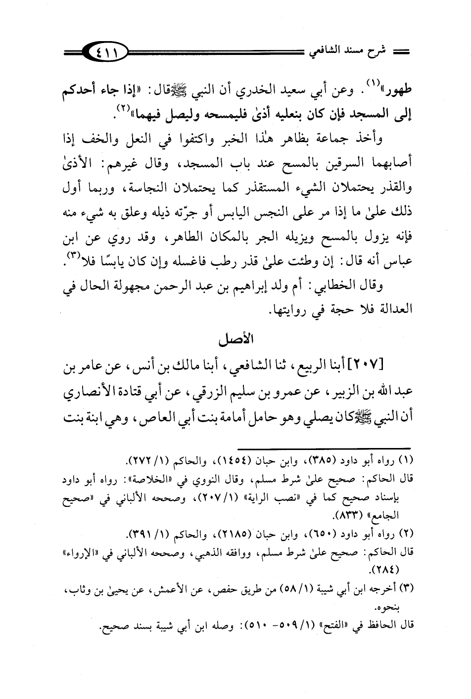 [207] أبنا الربيع، ثنا الشافعي، أبنا مالك بن أنس، عن عامر بن عبد الله بن الزبير، عن عمرو بن سليم الزرقي، عن أبي قتادة الأنصاري أن النبي - صلى الله عليه وسلم - كان يصلي وهو حامل أمامة بنت أبي العاص، وهي ابنة بنت