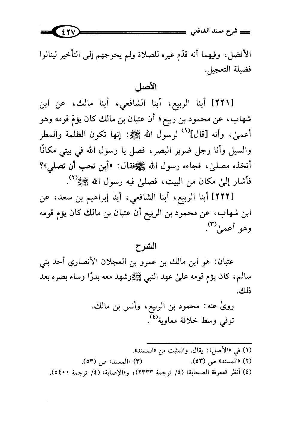 [222] أبنا الربيع، أبنا الشافعي، أبنا إبراهيم بن سعد، عن ابن شهاب، عن محمود بن الربيع أن عتبان بن مالك كان يؤم قومه وهو أعمى (¬3).