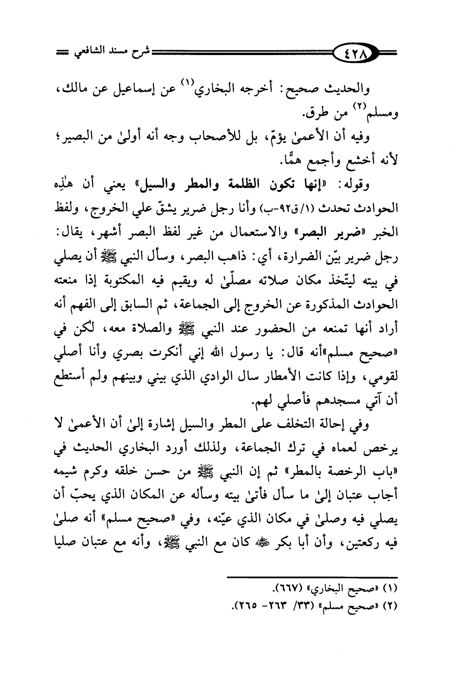 وقوله: "إنها تكون الظلمة والمطر والسيل" يعني أن هذِه الحوادث تحدث (1 / ق 92 - ب) وأنا رجل ضرير يشقّ علي الخروج، ولفظ الخبر "ضرير البصر" والاستعمال من غير لفظ البصر أشهر، يقال: رجل ضرير بيّن الضرارة، أي: ذاهب البصر، وسأل النبي - صلى الله عليه وسلم - أن يصلي في بيته ليتّخذ مكان صلاته مصلّى له ويقيم فيه المكتوبة إذا منعته الحوادث المذكورة عن الخروج إلى الجماعة، ثم السابق إلى الفهم أنه أراد أنها تمنعه من الحضور عند النبي - صلى الله عليه وسلم - والصلاة معه، لكن في "صحيح مسلم" أنه قال: يا رسول الله إني أنكرت بصري وأنا أصلي لقومي، وإذا كانت الأمطار سأل الوادي الذي بيني وبينهم ولم أستطع أن آتي مسجدهم فأصلي لهم.