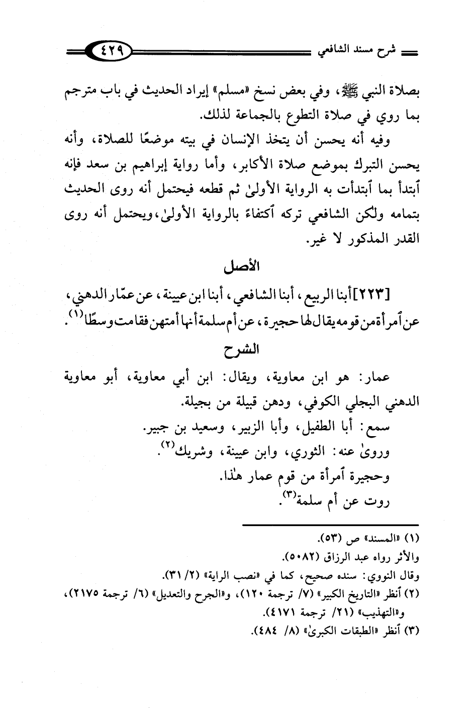 [223] أبنا الربيع، أبنا الشافعي، أبنا ابن عيينة، عن عمّار الدهني، عن امرأة من قومه يقال لها حجيرة، عن أم سلمة أنها أمتهن فقامت وسطًا (¬1).