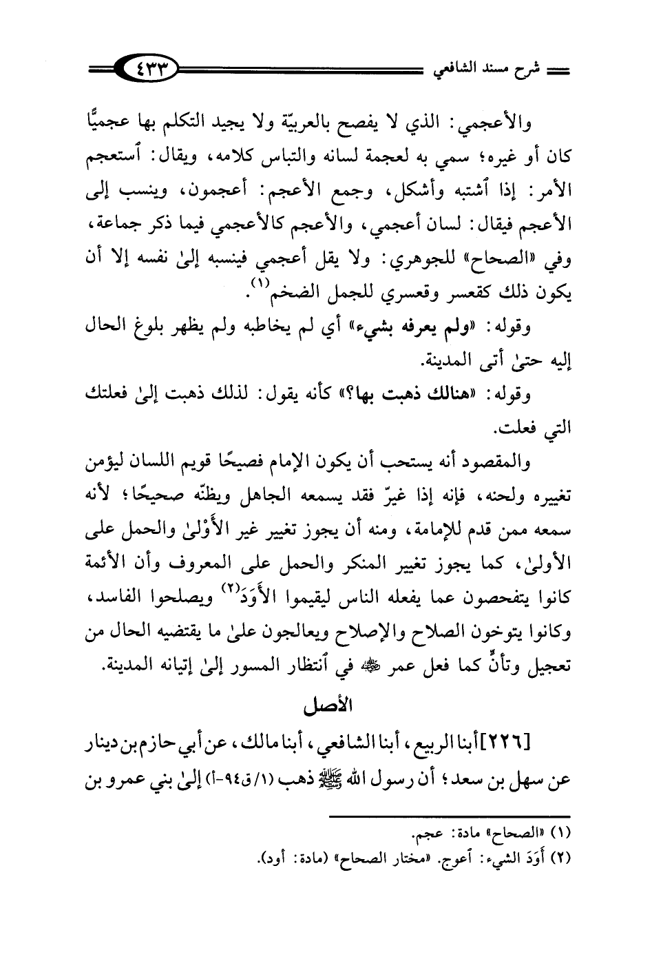 والمقصود أنه يستحب أن يكون الإِمام فصيحًا قويم اللسان ليؤمن تغييره ولحنه، فإنه إذا غيّر فقد يسمعه الجاهل ويظنّه صحيحًا؛ لأنه سمعه ممن قدم للإمامة، ومنه أن يجوز تغيير غير الأَوْلى والحمل على الأولى، كما يجوز تغيير المنكر والحمل على المعروف وأن الأئمة كانوا يتفحصون عما يفعله الناس ليقيموا الأَوَدَ (¬2) ويصلحوا الفاسد، وكانوا يتوخون الصلاح والإصلاح ويعالجون على ما يقتضيه الحال من تعجيل وتأنٍّ كما فعل عمر -رضي الله عنه- في انتظار المسور إلى إتيانه المدينة.