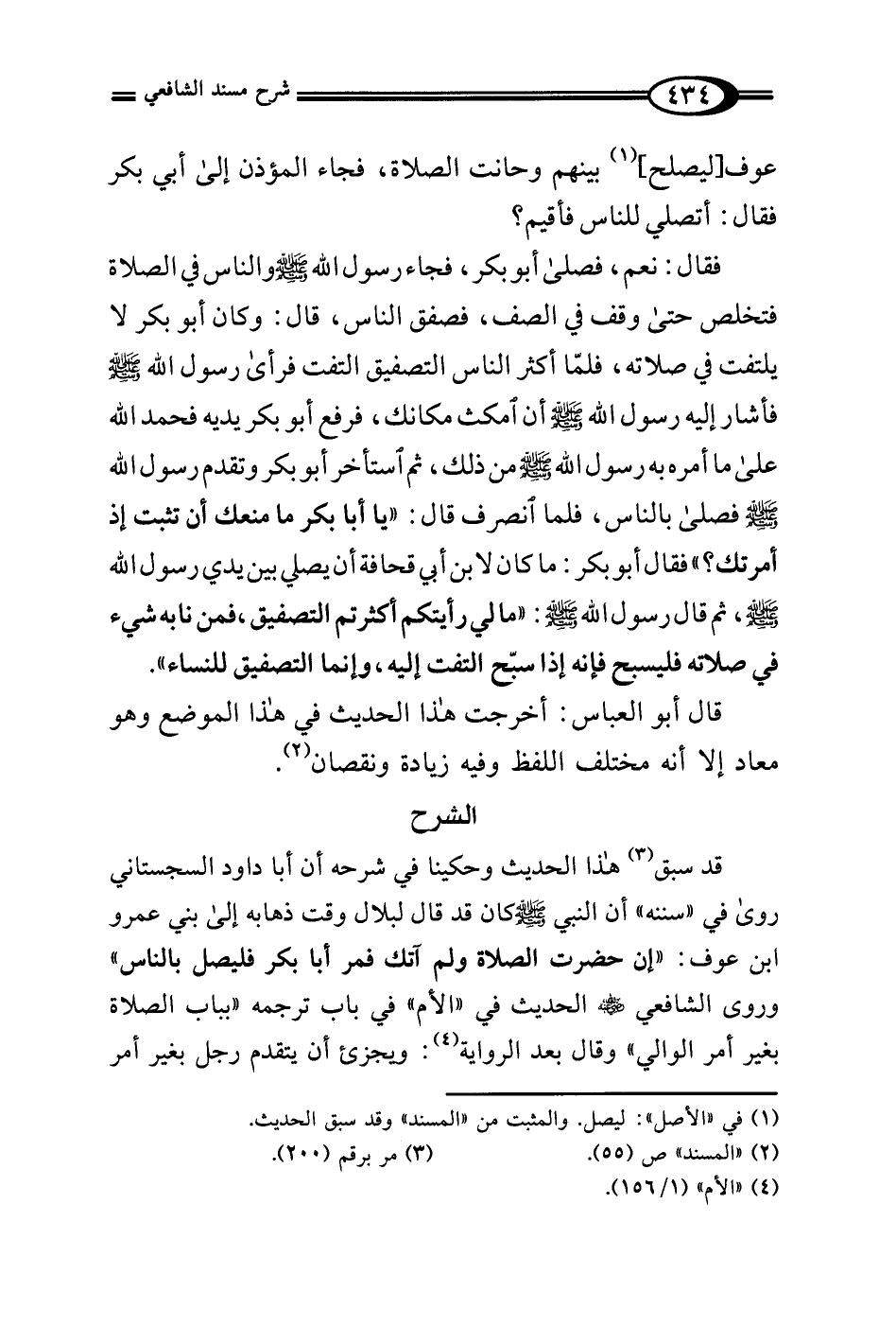 قد سبق (¬3) هذا الحديث وحكينا في شرحه أن أبا داود السجستاني روى في "سننه" أن النبي - صلى الله عليه وسلم - كان قد قال لبلال وقت ذهابه إلى بني عمرو ابن عوف: "إن حضرت الصلاة ولم آتك فمر أبا بكر فليصل بالناس" وروى الشافعي -رضي الله عنه- الحديث في "الأم" في باب ترجمه "بباب الصلاة بغير أمر الوالي" وقال بعد الرواية (¬4): ويجزيء أن يتقدم رجل بغير أمر