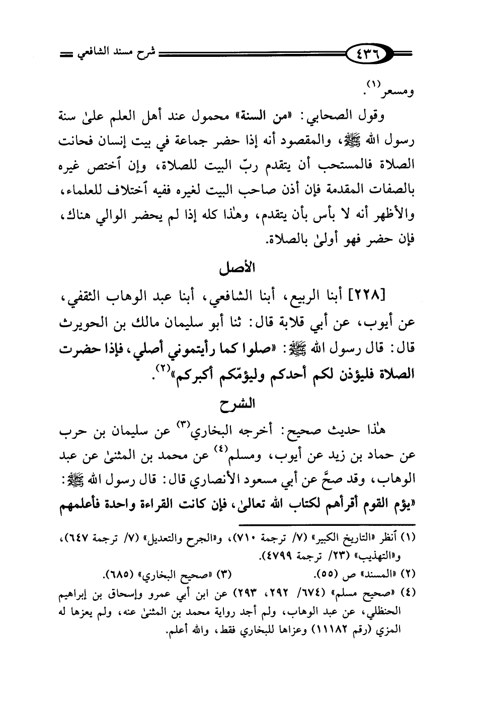 [228] أبنا الربيع، أبنا الشافعي، أبنا عبد الوهاب الثقفي، عن أيوب، عن أبي قلابة قال: ثنا أبو سليمان مالك بن الحويرث قال: قال رسول الله - صلى الله عليه وسلم -: "صلوا كما رأيتموني أصلي، فإذا حضرت الصلاة فليؤذن لكم أحدكم وليؤمّكم أكبركم" (¬2).