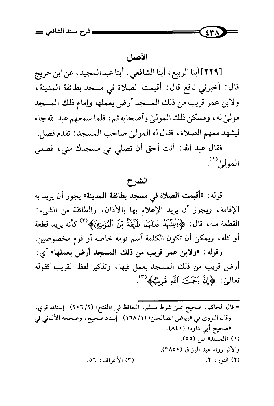 [229] أبنا الربيع، أبنا الشافعي، أبنا عبد المجيد، عن ابن جريج قال: أخبرني نافع قال: أقيمت الصلاة في مسجد بطائفة المدينة، ولابن عمر قريب من ذلك المسجد أرض يعملها وإمام ذلك المسجد مولى له، ومسكن ذلك المولى وأصحابه ثم، فلما سمعهم عبد الله جاء ليشهد معهم الصلاة، فقال له المولى صاحب المسجد: تقدم فصل.